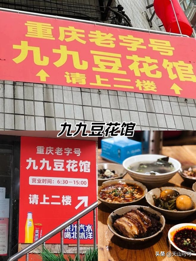 解放碑巷子里的这家老店,是重庆人记忆里的早餐圣地。**豆花**细嫩如绢帛,可选咸甜两吃:咸口配青椒蘸水,甜口浇红糖姜汁。搭配的**粉蒸排骨**软糯咸香,底层垫的红薯吸足肉汁,甜咸交织的滋味让人念念不忘。清晨来这里,看老街坊用筷子"赶"豆花的娴熟手法,才是地道的重庆晨景。