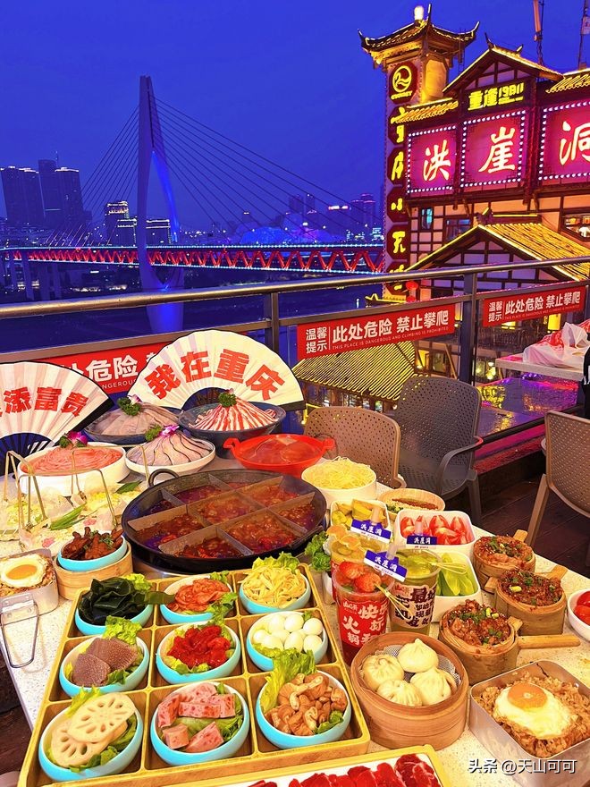 洪崖洞的吊脚楼里藏着这家"三样招牌"火锅:**屠场鲜毛肚**每日凌晨直送,涮9秒脆嫩化渣;**双椒牛肉**用青红椒腌制,麻辣中带着清香;**手工黑豆腐**豆香浓郁,久煮不散。坐在窗边看江景沸腾,才是重庆火锅的正确打开方式。
