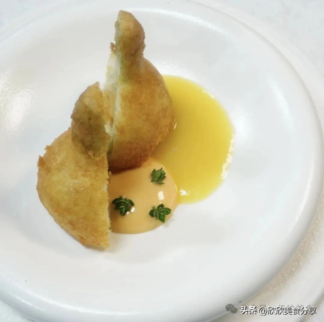 5、组装:将炸洋蓟放入餐盘中,旁边挤入腐乳黄油酱,点缀百里香叶,淋入黄柠檬酱即可