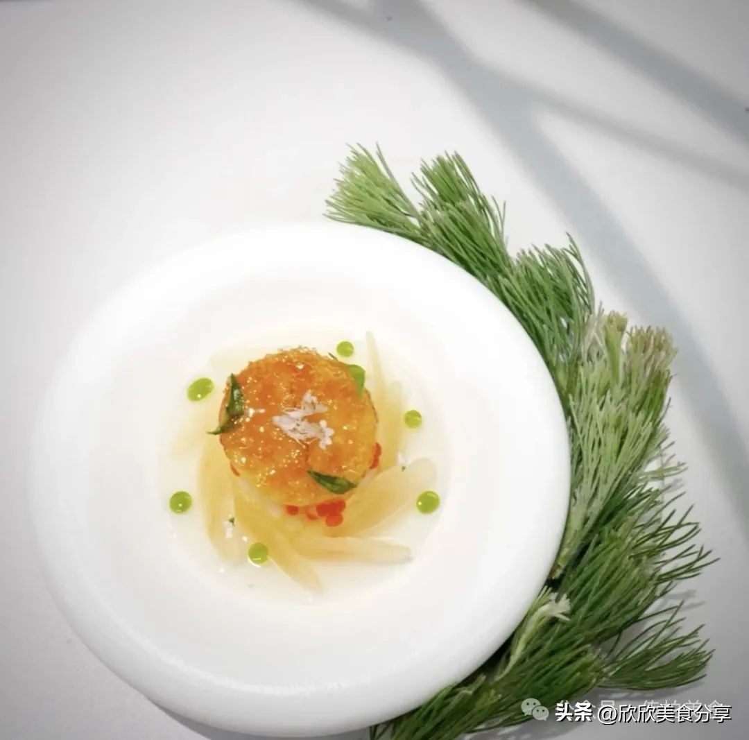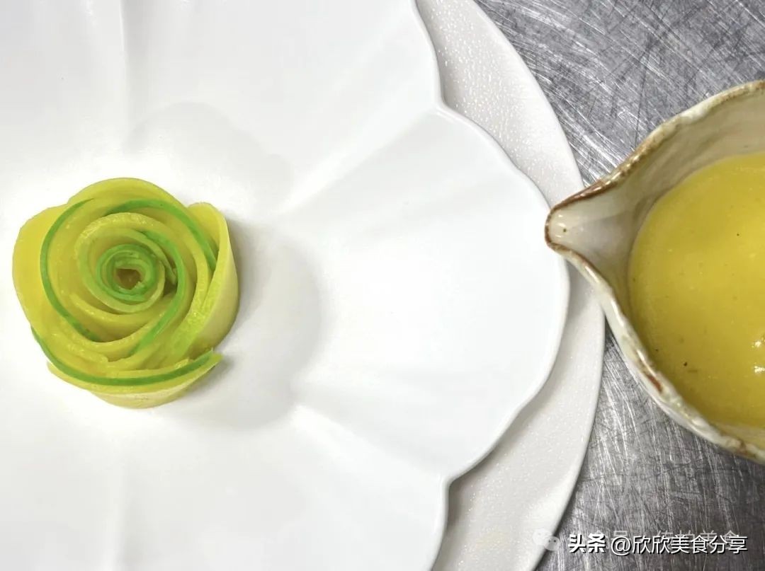 50g橄榄油、20g白砂糖、5g柠檬汁、香菜英一根、黄芥末酱5g、1g黄原胶,将所有食材放入料理杯中打制细腻乳化,放入挤瓶中备用