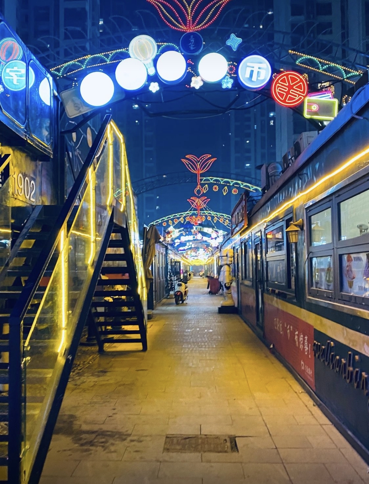 然后可以去火车头步行街逛逛,它在裕华区万达步行街中心塔东侧。这条街以火车拉来的城市为主题,特别有意思。西街区是集装箱艺术街区,拍照好看,随便一拍都能出片。东街区主要是休闲游乐和儿童业态,带娃的家长可以在这里轻松溜娃。街上还有各种小吃和文创店,逛累了就吃点东西,买点小纪念品,感受一下咱石家庄的烟火气。