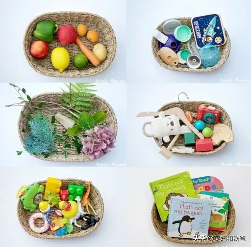 准备几个盒子或篮子,给宝宝装上不同的物品。家里不同的日常物品都可以用来做感官盒,目的是给宝宝不同的触感和体验。 可以从下面几个方面来准备你的盒子,触觉(触摸)、听觉(声音)、视觉(颜色)、嗅觉(气味)、味觉(*我觉得这个用到比较少)