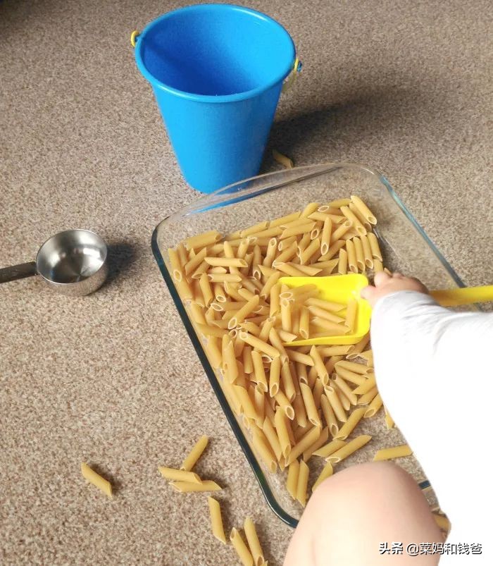 1岁以后宝宝开始慢慢学习使用勺子自己吃饭啦!日常也可以在游戏里融入类似的活动,锻炼手部灵活性,更好地拿稳小勺子。 比如用大一些的小铲子舀意大利面,舀小盖子、小纽扣之类的。