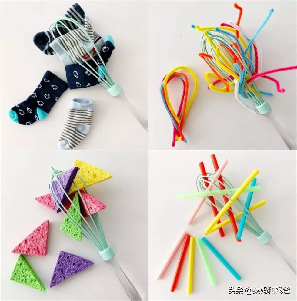 准备一个手动的打蛋器,各种生活物品。你可以把物品放入打蛋器间隙中,让宝宝从里面把东西取出来。