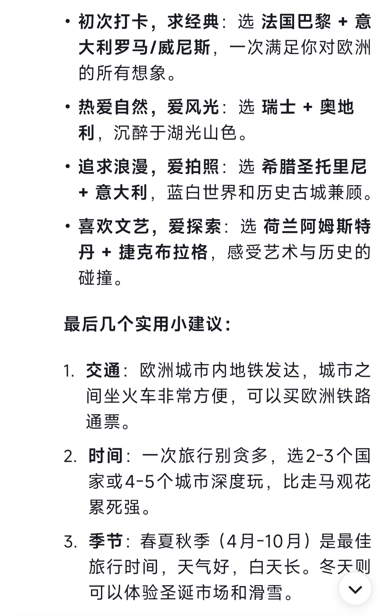 欧洲是一个历史悠久、文化丰富、风景如画的大陆,有很多“必去”的地方。选择哪些取决于你的兴趣(历史、艺术、自然、美食、都市风光等)和时间。不过,以下是一些被广泛认为不容错过的经典目的地: