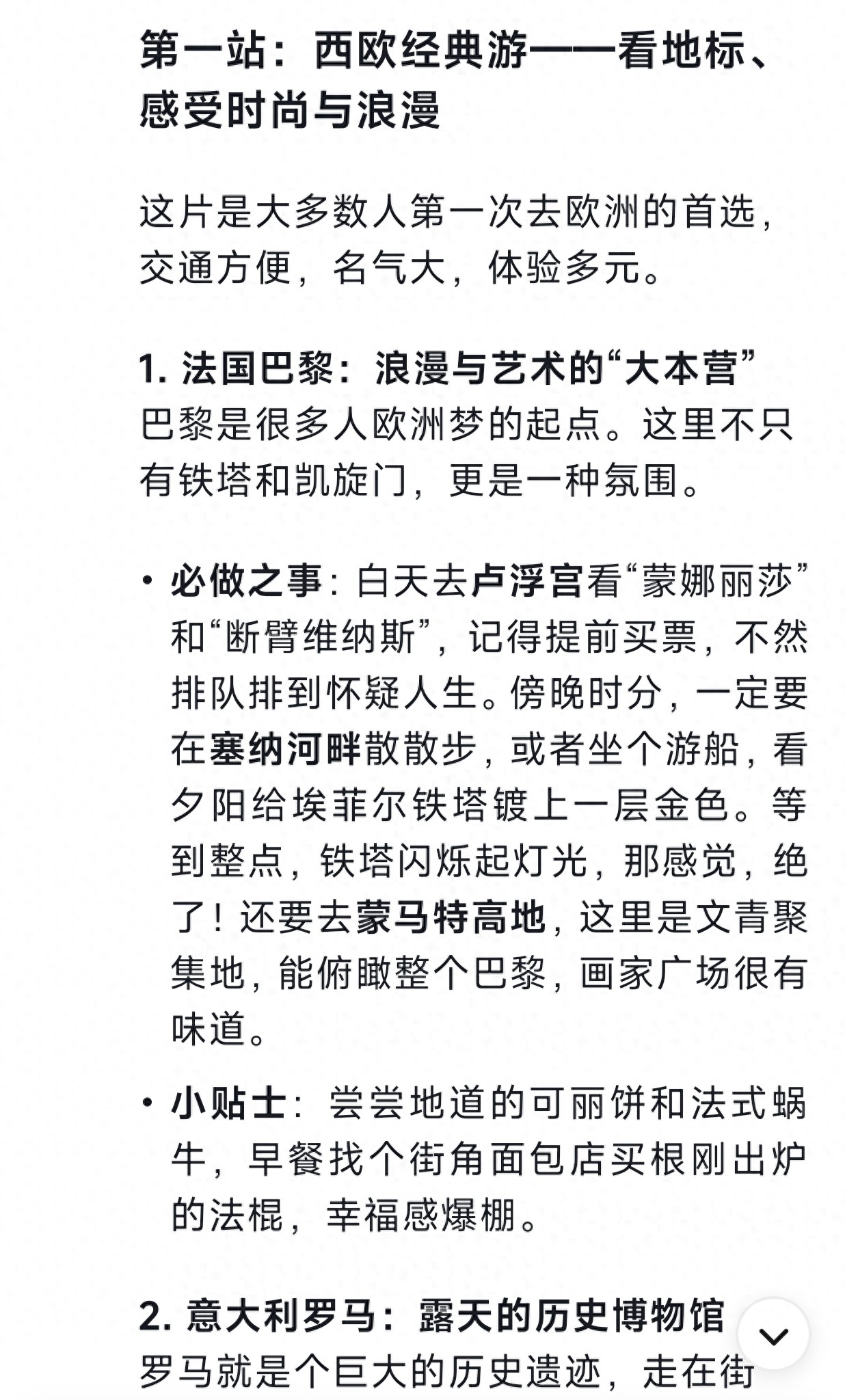 2. "意大利罗马 (Rome, Italy):" “永恒之城”,西方文明的摇篮。必看:罗马斗兽场、梵蒂冈(圣彼得大教堂、西斯廷教堂)、万神殿、特雷维喷泉。触摸历史,感受宗教与艺术的辉煌。