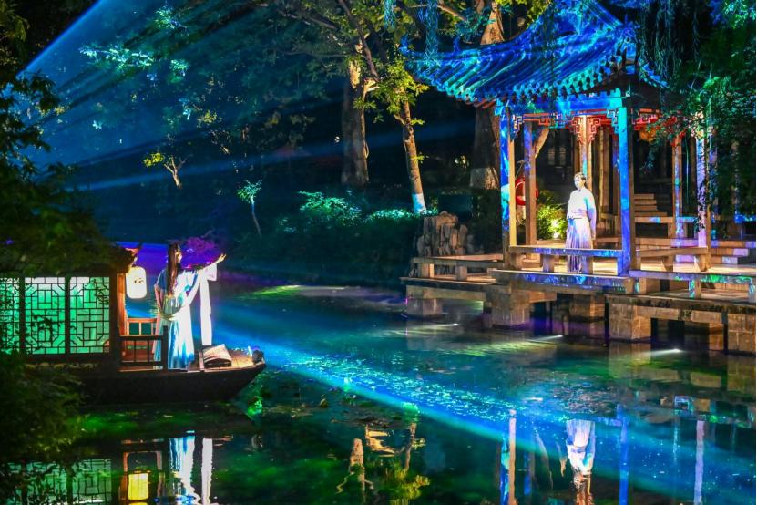 国庆、中秋双节假期期间,济南趵突泉景区推出沉浸式夜游项目——《趵突夜画》,融合泉水风光、宋代美学、清照词韵与现代光影技术,将夜晚的趵突泉景区打造成为集文化体验、艺术观赏、科技互动于一体的沉浸式夜游新空间,带领游客开启一场穿越时空、梦回千年的夜游之旅。