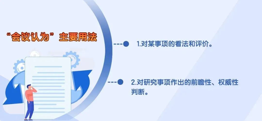 “认为”是对人或事物确定某种看法,做出某种判断。“会议认为”用于对会议讨论或研究的某事项作客观性的描述,反映参会者的一致意见或大多数参会者的观点和态度,主要有两种用法。一是对某事项的看法和评价。二是对研究事项作出的前瞻性、权威性判断。