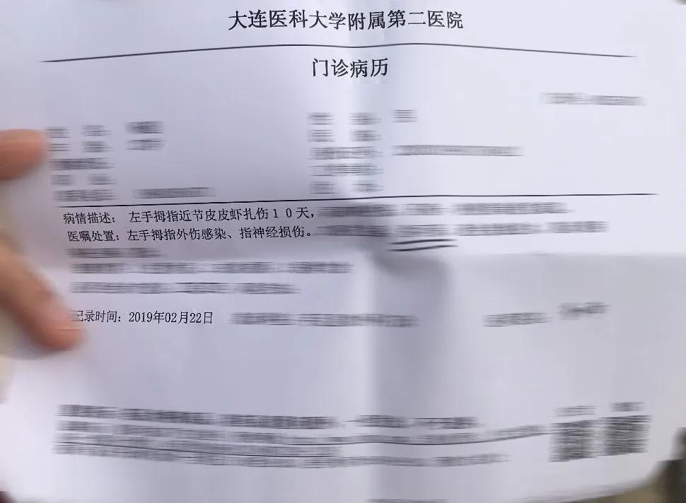 在被皮皮虾击穿 10 天之后,拇指依然是麻木的,于是笔者去了医院。在其他患者“你咋还能让那玩意给打了”的嘲笑声中,医生给出了诊断:左手拇指外伤感染,指神经损伤。