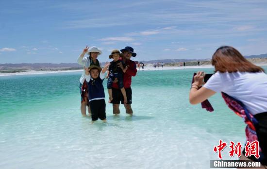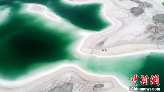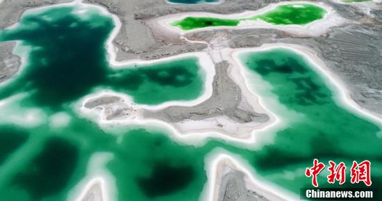 7月25日,青海省海西蒙古族藏族自治州境内,形态迥异、深浅不一的盐池宛如一块块晶莹剔透的“翡翠”。约6平方公里的“翡翠湖”名为大柴旦湖,是原大柴旦化工厂盐湖采矿队采矿区,经多年开采形成采坑,变成了如今美丽的“翡翠湖”。站在湖边,宛若镜面般的湖面倒影着蓝天白云和皑皑雪峰,宛如仙境。图为清澈湛蓝的湖水。