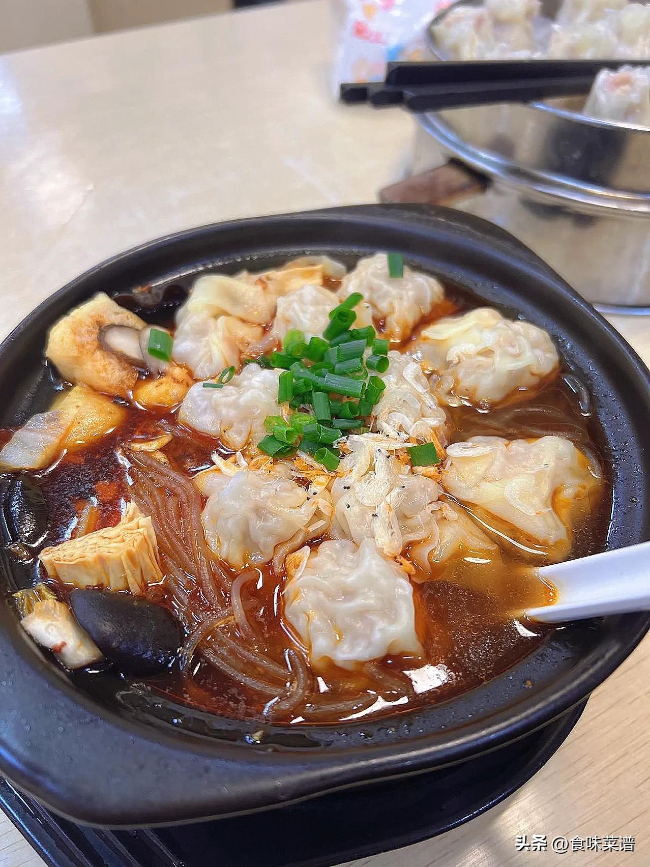 海鲜馄饨是招牌,每只馄饨里都有整颗虾仁和瑶柱,虾仁 Q 弹,瑶柱提鲜,馄饨皮滑嫩,汤里撒点葱花和虾皮,鲜得能把汤都喝光。