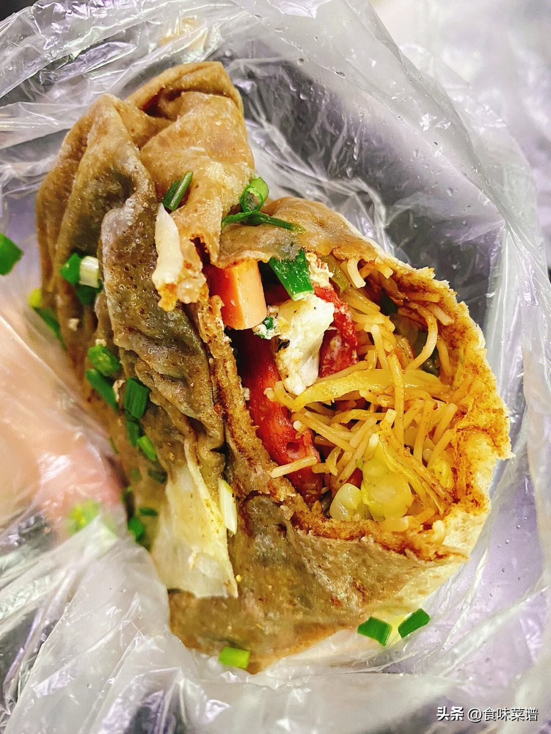 咬一口,玉米饼的脆、粉丝的软、里脊的嫩、鸡蛋的香,在嘴里交织,酱汁渗透到每一层,越吃越香,一个就能顶饱,当午餐或晚餐都合适。