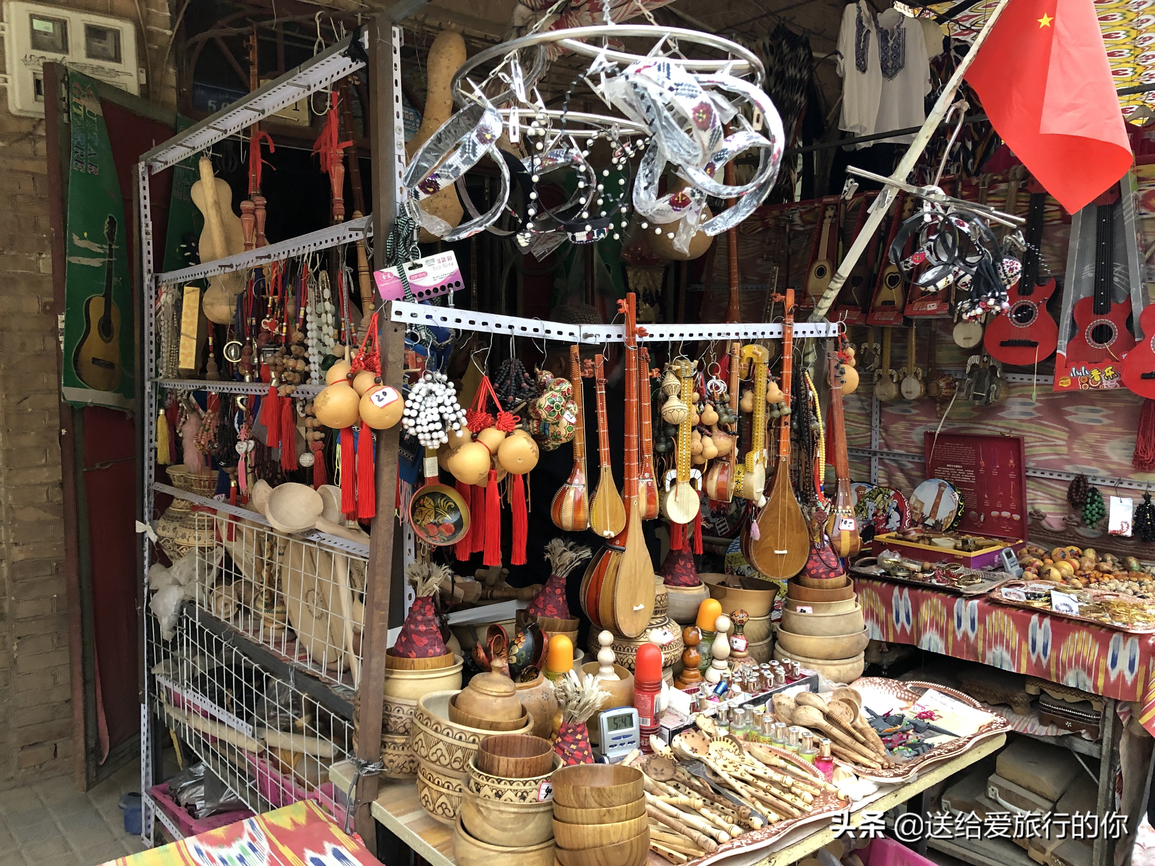 喀什老城里也陈列着各色的物品琳琅满目供人们挑选,民族服饰、民族乐器、各色美食凝聚了几乎新疆的全部,只有你没见过的没有这里没有的。最具特色的恐怕要数挂毯、地毯、各类毯子。毯子几乎都是羊毛手工制造,图案也各有特色,有的描绘了宁静的村寨、有的展现出各色动物的活力、有的似乎在讲述着故事、也有的寄托着美好愿望的图腾、还有美丽的花草树木……挑选一两件当作纪念真是很好的选择。