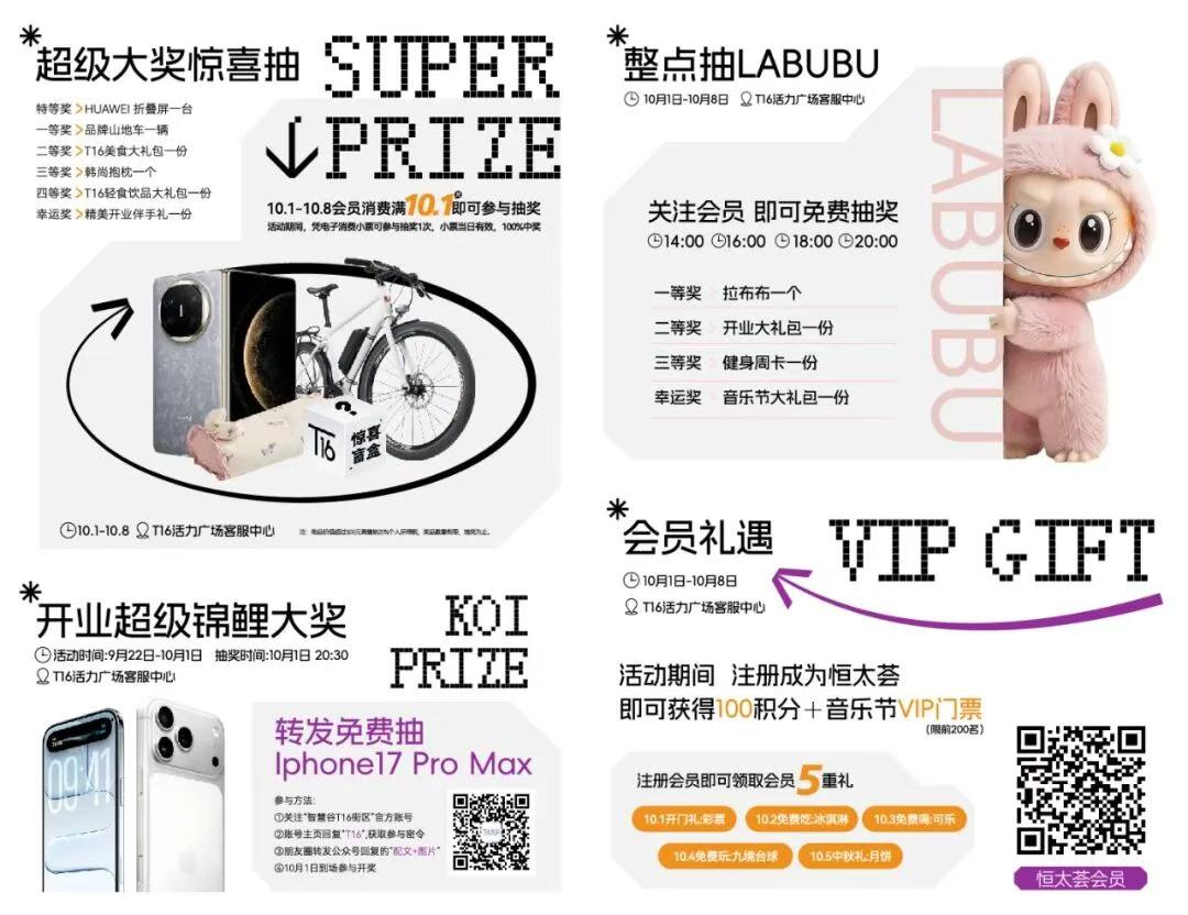 消费满额抽奖:会员消费满10.1元即可参与“超级大奖惊喜抽”活动,送华为折叠屏手机、品牌山地车以及美食、饮品大礼包、开业伴手礼等奖品,100%中奖。超级锦鲤抽奖:包含Iphone17 Pro Max,5000元美人瑜精品课程卡、1999元韩尚家居高端四件套、1999元乐适健身年卡、1000元欢喜馄饨储值卡以及8份价值128元扶摇直上套餐的开业超级锦鲤大奖,独宠一人。10月1日18:30,相约智慧谷T16艺文活力街区活力广场,一起揭晓幸运儿。