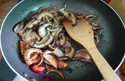 准备一个洋葱,用清水冲洗干净,然后用刀将洋葱切成片放入碗中备用,接着准备适量3-4个花菇,用清水冲洗干净,清洗干净后同样用刀将花菇切成片状。起锅烧油,油温烧至8成熟,将切好的洋葱倒入锅中,炒出香味后将花菇倒入锅中翻炒,洋葱水分彻底炒干,并且花菇炒软后就可以控油捞出备用。