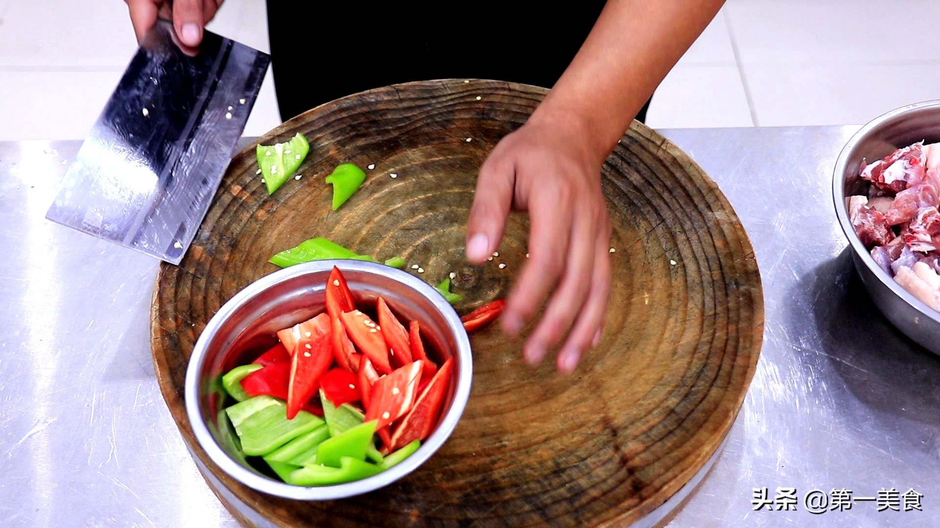 2 . 青椒、红椒各一个,把蒂去除,切成菱形块,这样可以为菜品增色,大葱切成马蹄片状,生姜切成片,