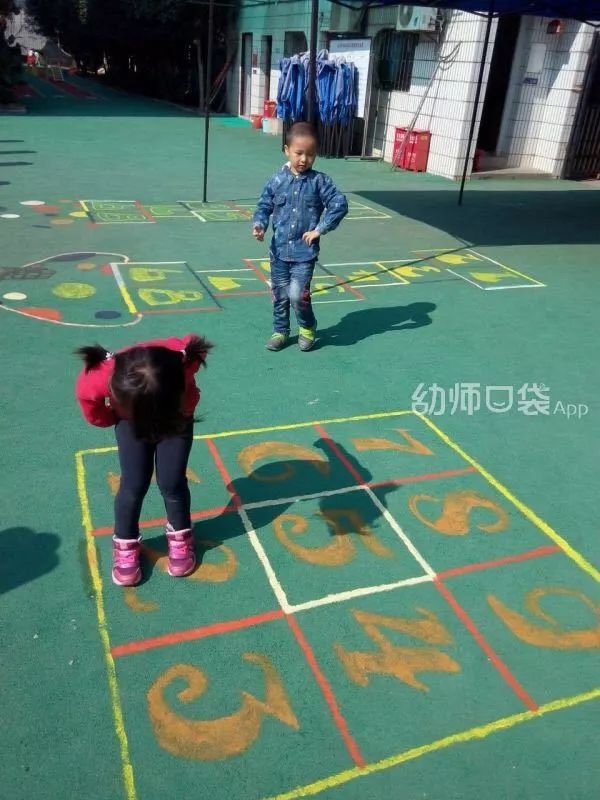 户外地上画的田字格,不需要材料,孩子们就能玩。还可以准备小木块,扔到数字几,孩子就跳过去捡哦。