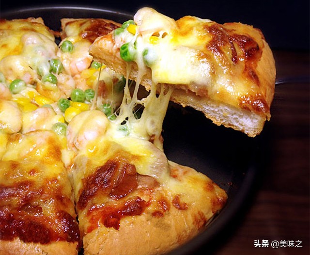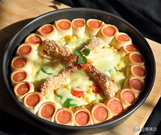 高筋面粉100克、低筋面粉50克、温水90ml、酵母3克、盐1∕4小勺、糖1小勺、黄油15克、猪肉肠1根、鲜虾适量、玉米粒适量、豌豆适量、马苏里拉奶酪160克、亨氏番茄酱适量。