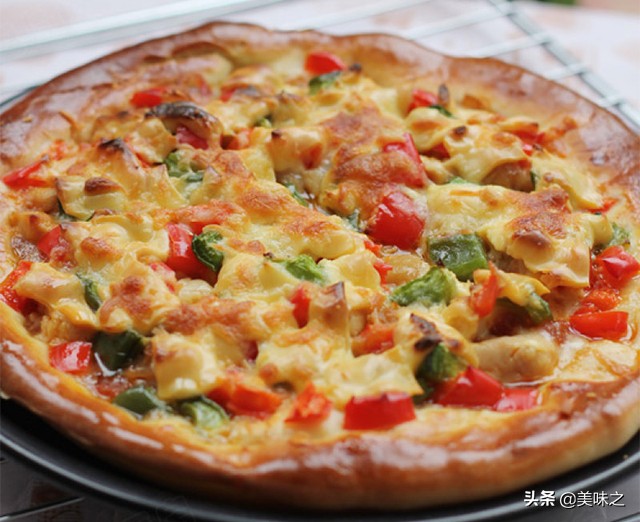 14、出炉了,烤好的披萨表面富有光泽;气味鲜香诱人,饱满的鸡肉的鲜香味,令人垂涎三尽。
