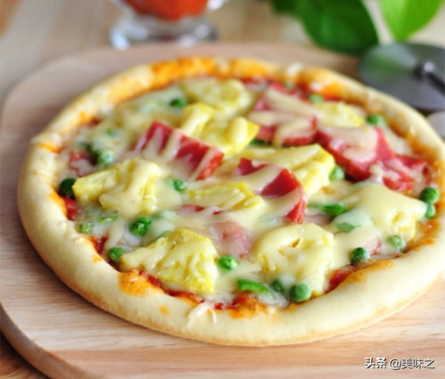 17、依次摆上火腿片、菠萝片,撒上剩余的芝士丝,点缀豌豆粒和青椒粒,再入烤箱,原温度烤8到10分钟,至表面芝士融化即可。