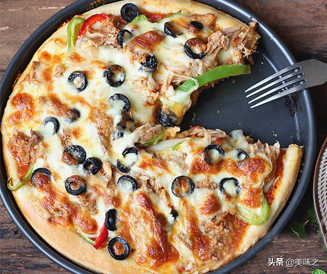 中粉160克、水90克、香辣金枪鱼罐头一个180克、陈年干酪70克、马苏里拉奶酪80克、盐2克、酵母2克、无味植物油10ml、青红椒少许、黑橄榄适量、芝士粉适量。