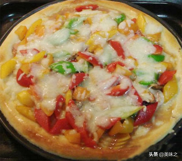 7、紧接着撒上洋葱丝、玉米粒,彩椒,最后再撒上厚厚的一层奶酪丝就可以了