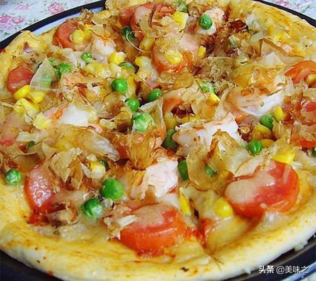 中筋面粉300克、黄油15克、水120毫升、白砂糖10克、酵母4克、盐2克、奶粉15克、木鱼花适量、培根适量、虾仁适量、披萨酱适量、豌豆适量、玉米粒适量、马苏里拉奶酪适量。
