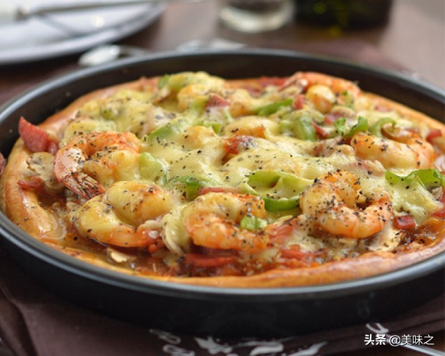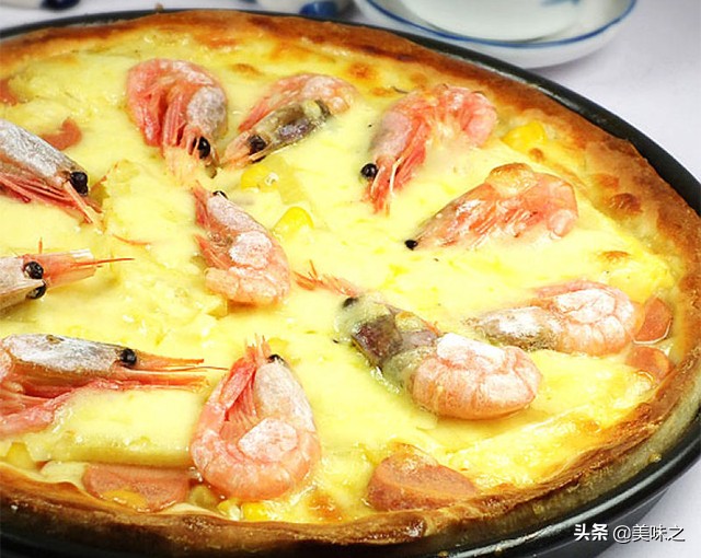 火腿80g、大虾8个、面粉200g、马苏里拉奶酪130g、口蘑适量、洋葱适量、奶粉适量、鸡蛋适量、青椒适量、大蒜适量、黑胡椒适量、披萨草适量、盐和鸡精适量、白糖10g、酵母5g、橄榄油一大勺、胡椒粉适量、料酒适量。
