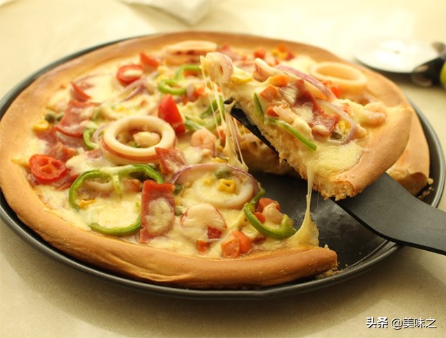 高筋粉160克、低筋粉40克、牛奶125克、黄油10克、盐3克、糖10克、酵母3克、披萨酱2勺、虾仁120克、鱿鱼圈100克、培根适量、杂蔬50克、洋葱适量、青椒适量、圣女果3个、马苏里拉芝士220克。