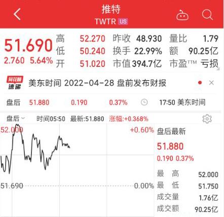 收购消息发布后,截至当地时间4月25日收盘,特推报51.69美元/股,涨幅5.64%,市值394.77亿美元。