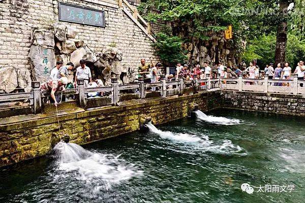 开始的时候我有点失望,走了一段路还没有看见泉,可在一个石砌的池子里,有人说是泉。我走近看了看,一串串水泡不住点地冒着,真的没有我想象中的气势,禁不住多了一些失望。
