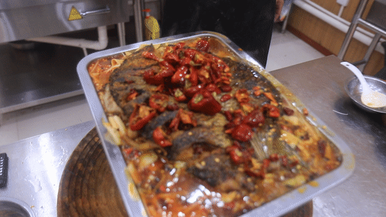 加入一勺食盐、一勺胡椒粉、一勺鸡精以及少许白糖提鲜。等汤汁烧开以后,先把白菜和豆腐皮放入锅中煮一会,再倒入金针菇和川粉继续煮1分钟。食材煮至八成熟时起锅,把酒精点燃,把配菜倒在烤盘中垫底,再放上煎好的鱼,等待激油。