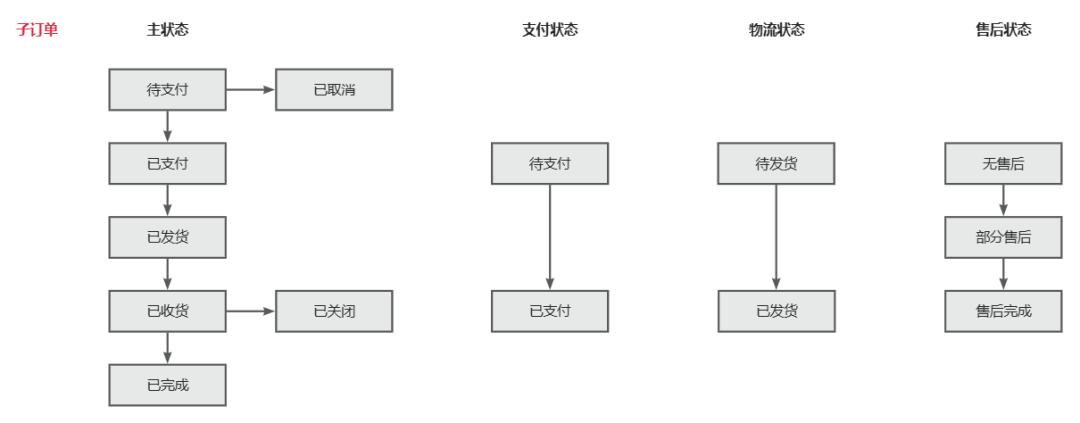 - 主状态:订单核心状态,包括待支付、已取消、已支付、已发货、已收货、已关闭、已完成