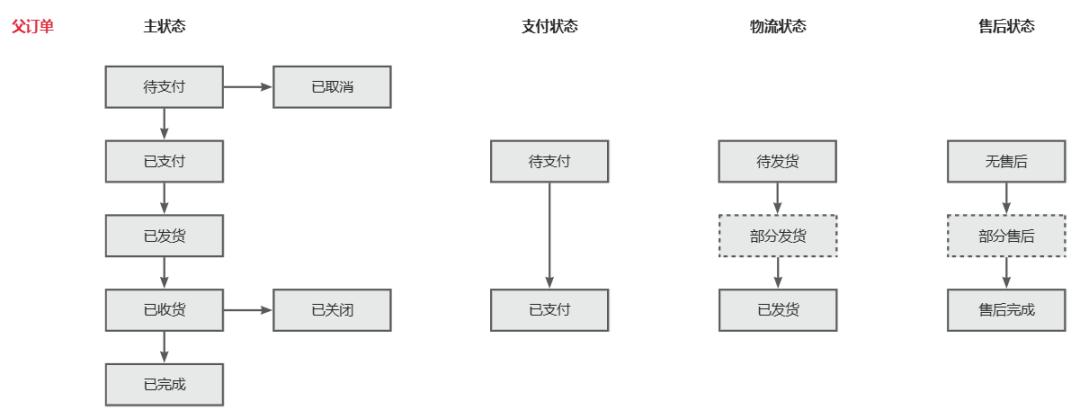 订单状态机设计,建议区分多维度,包括主状态、支付状态、物流状态和售后状态,同时区分父子订单状态。