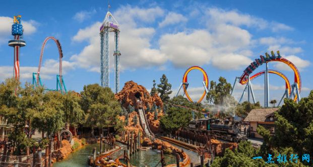世界上排名前十的游乐园之一是六旗魔术山,它是拥有最多过山车的游乐园。六旗魔术山有着飓风湾、边境主题、沙漠景观、武士峰会等多个主题公园,可以让游客多向的选择。