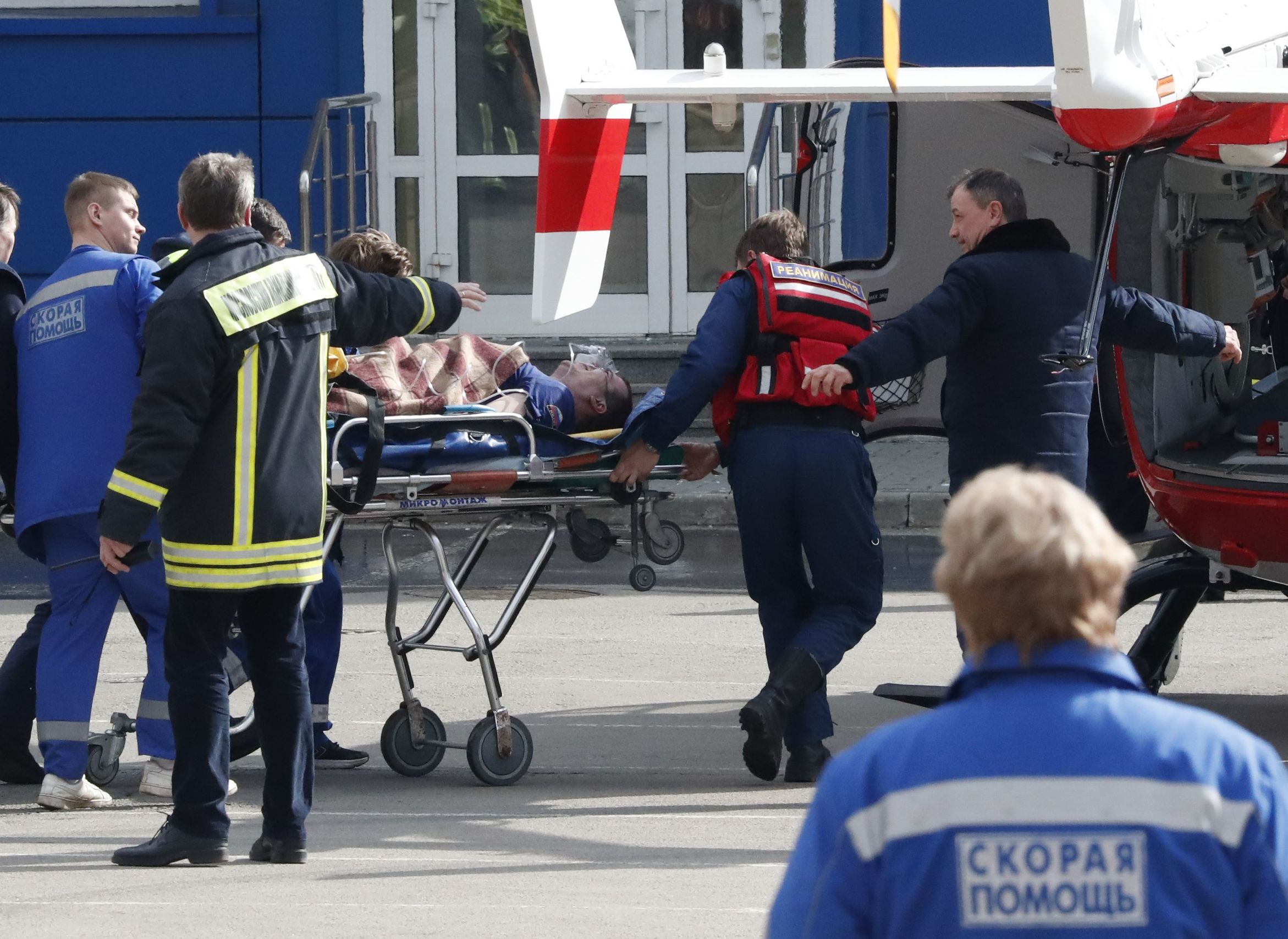 4月4日,在俄罗斯莫斯科东部,人们将受伤者送上救援直升机。