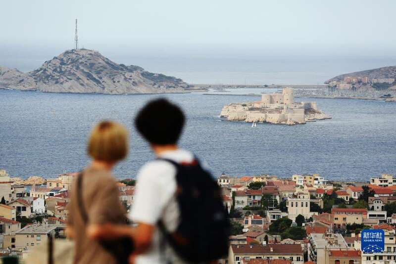 9月3日,一对情侣在法国马赛的守护圣母教堂上眺望远处的伊夫岛。新华社记者 高静 摄