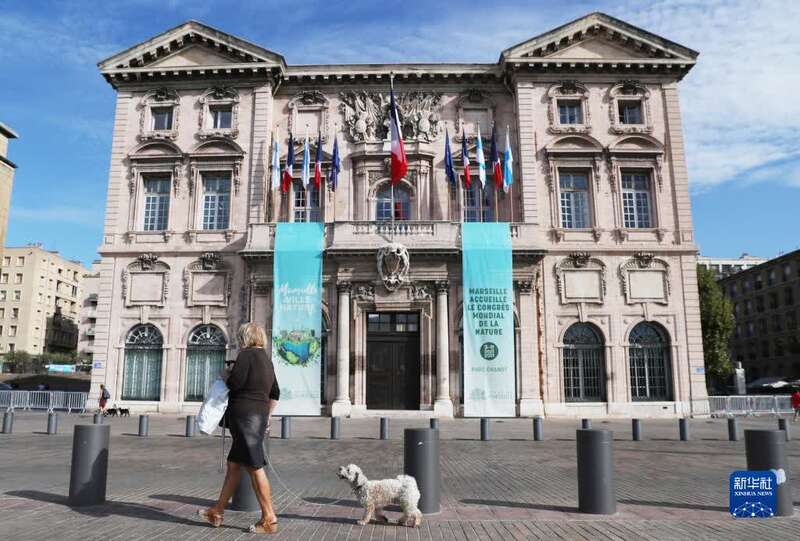 9月4日,一名女子在法国马赛市政厅前遛狗。新华社记者 高静 摄