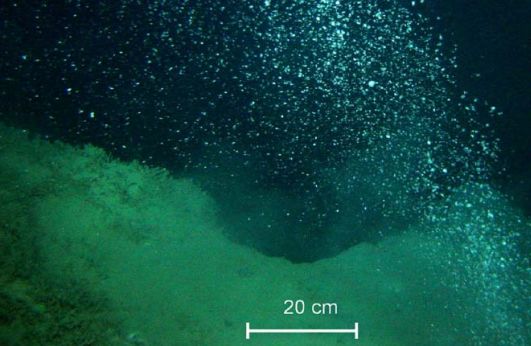 2003年拍摄到的挪威海域Hkon Mosby 泥火山逸散到海水中的甲烷气泡。图片来源:参考文献