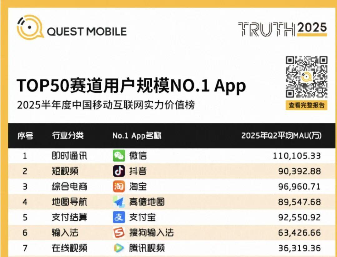 内部也有一套对成长阶段的理解——高德曾称的“121理论”。当DAU到达百万级,只需把单一功能做精;到了2000万级别,可以从单一体验向平台思路延展;当超越亿级流量后,就有能力做分发,去做更多事。高德这次的优势是高频使用场景带来的天然入口:出行的起点和终点,给他们机会切入更多生活服务。到2025年第二季度,高德月活已经到8.9亿,在阿里体系里仅次于淘宝,成为第二大App。扫街榜用户达到4亿,渗透率接近半数,这说明一半左右的高德用户在打开App后,会去看这个榜单去找吃的。