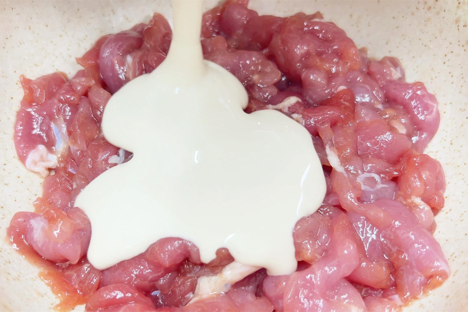 1、里脊肉放冰箱冷冻半小时,拿出来切片,加一勺料酒、一勺生抽、少许盐和胡椒粉抓匀。里脊肉里再打入半个蛋清,抓匀至蛋清充分吸收,腌十分钟。