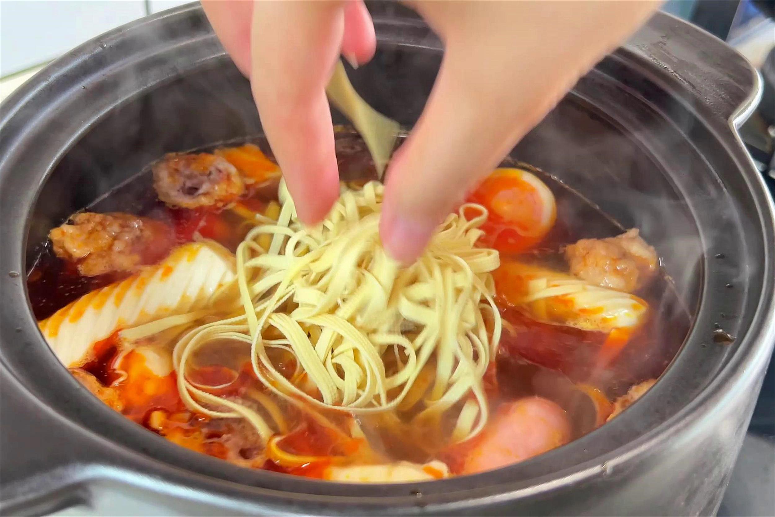 所需食材:土豆粉一袋、豆腐皮、海带、海鲜丸子、肉丸、上海青、金针蘑、鹌鹑蛋、火锅底料、生抽、蚝油、盐、鸡粉、白糖