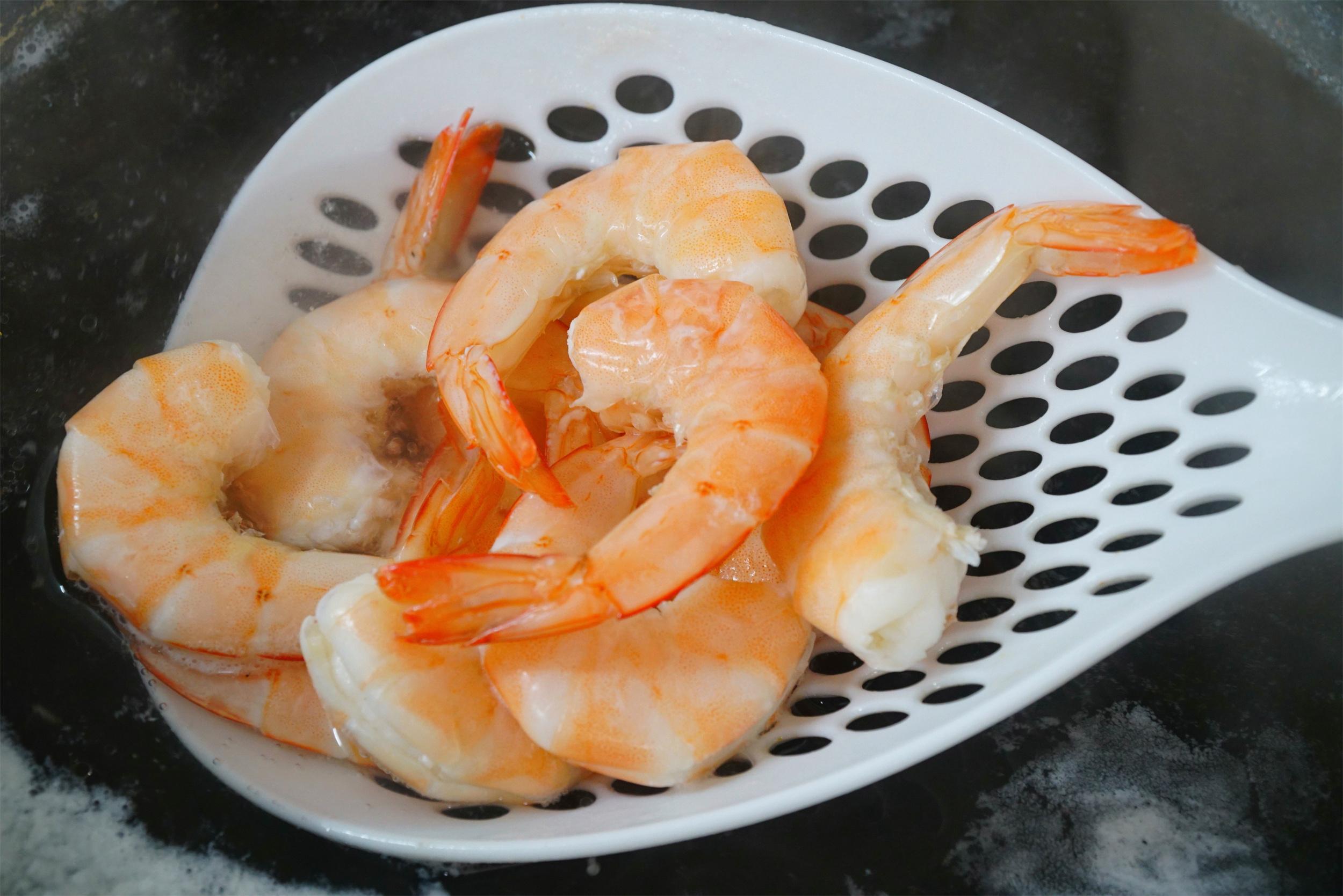1、皮肚冲洗干净,切成小块,午餐肉也取出切块,上海青洗净,另切葱花、蒜末备用。鲜虾去头,开背挑出虾线,清洗干净,煮锅接水烧开,放一勺盐和油,倒入虾仁,焯水煮至变色后捞出。