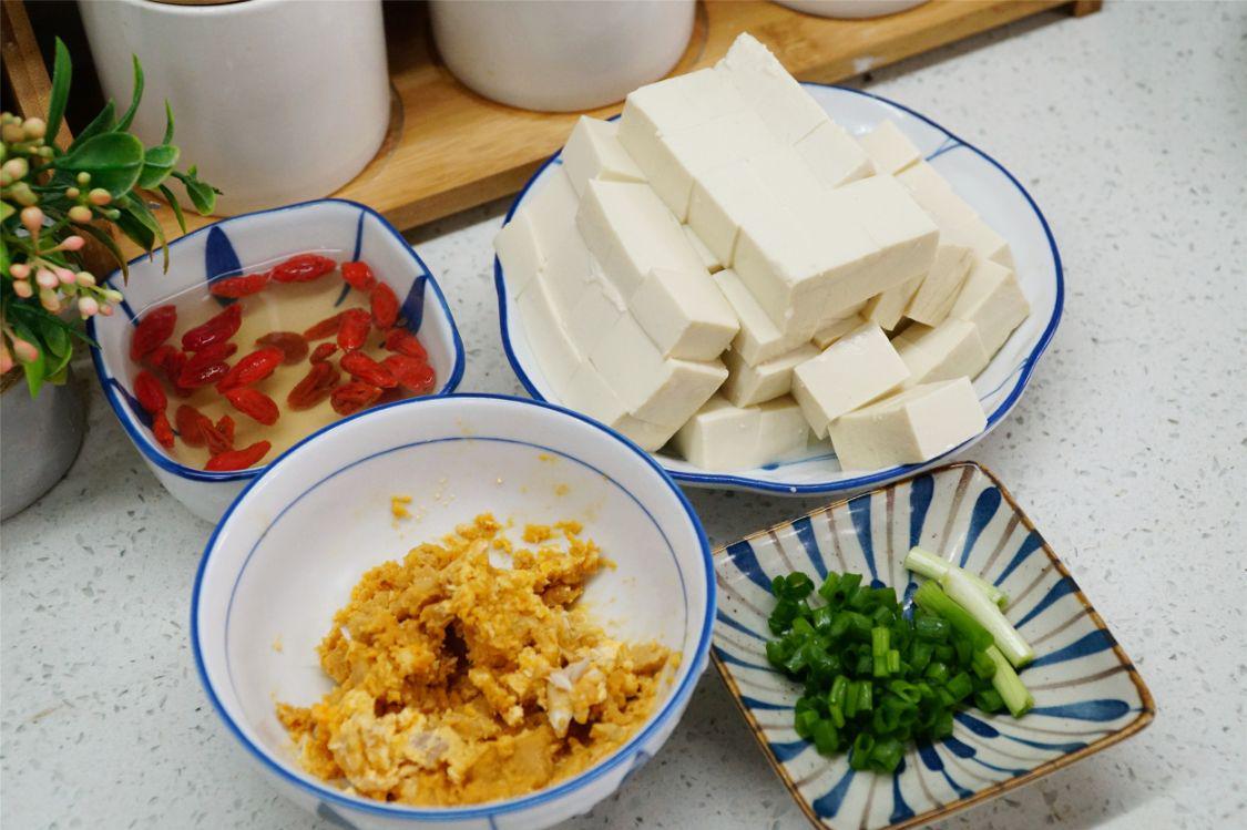 所需食材:咸鸭蛋3个、豆腐一块、枸杞一把、小葱一根、姜一块。