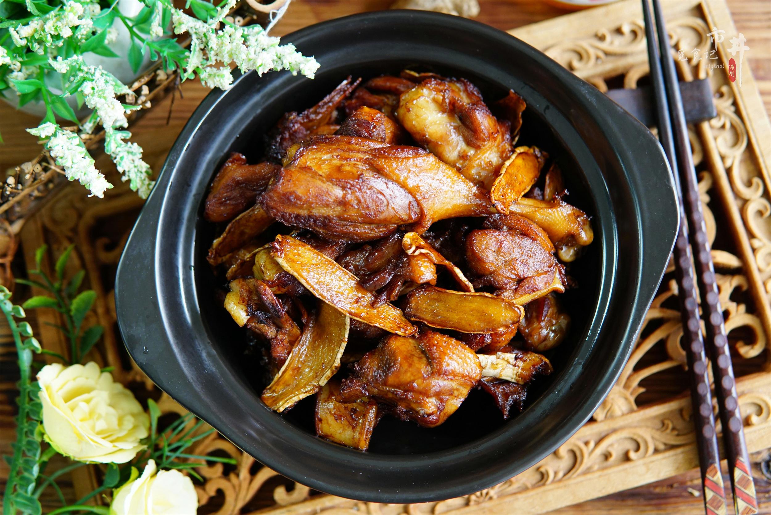 5、盖上砂锅盖子,慢煲四十分钟,每五分钟给鸭肉翻个面,煲至汤汁快烧干,只余一些底油即可出锅。