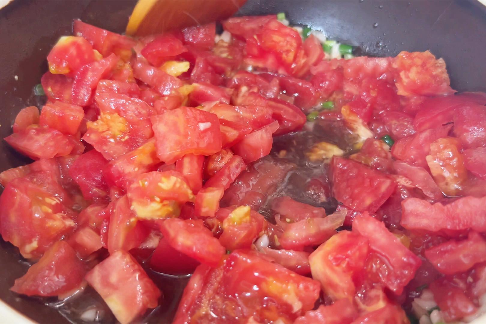 5、砂锅倒油烧热,放葱姜蒜末炒香,倒入西红柿块炒出汤汁,放适量盐和两勺番茄酱、一勺蚝油调味。