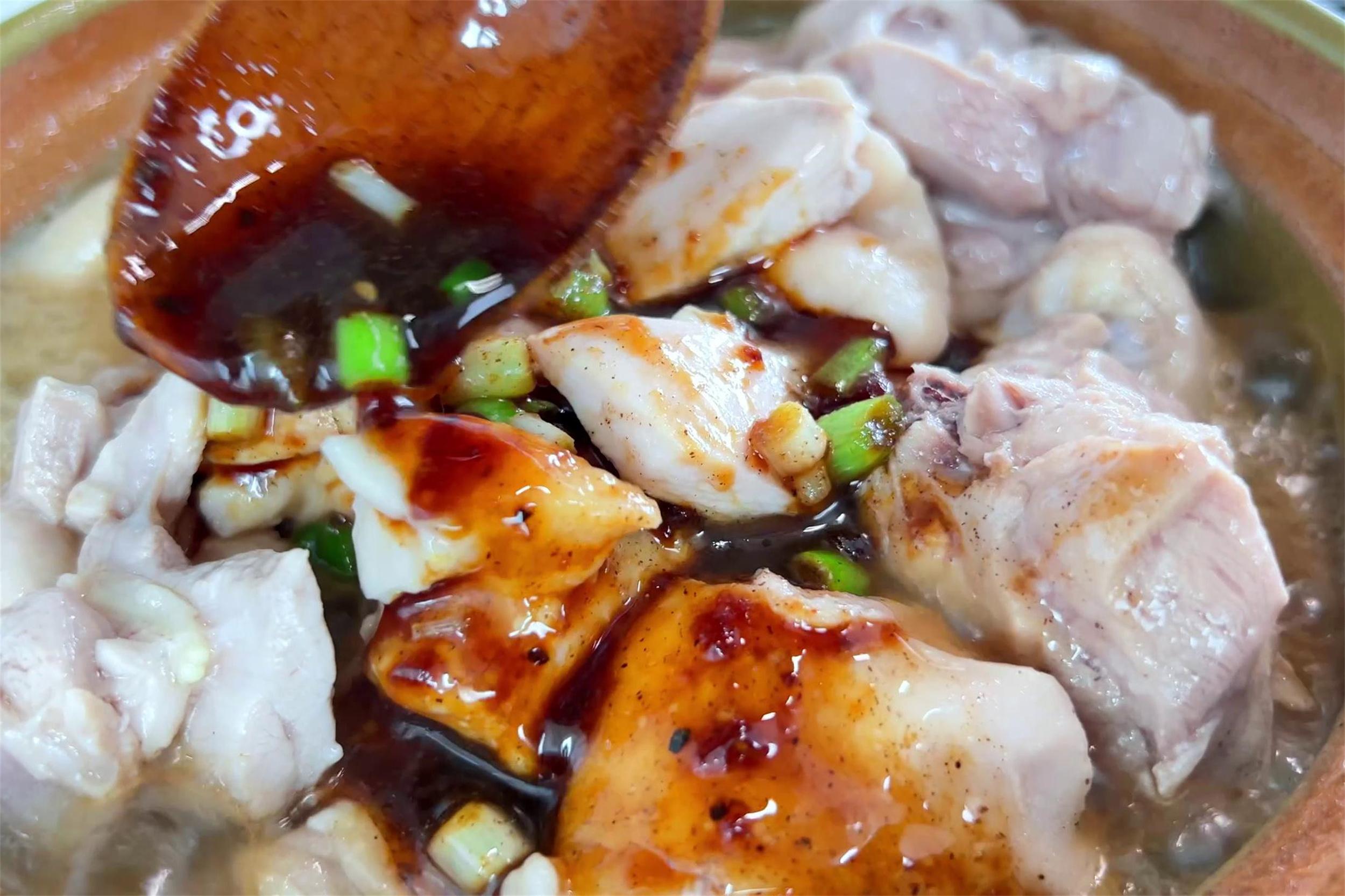 5、焖好后,淋上一圈老抽上色,翻炒均匀后,撒上小葱段即可关火,鲜辣嫩滑的砂锅胡椒鸡就做好了。
