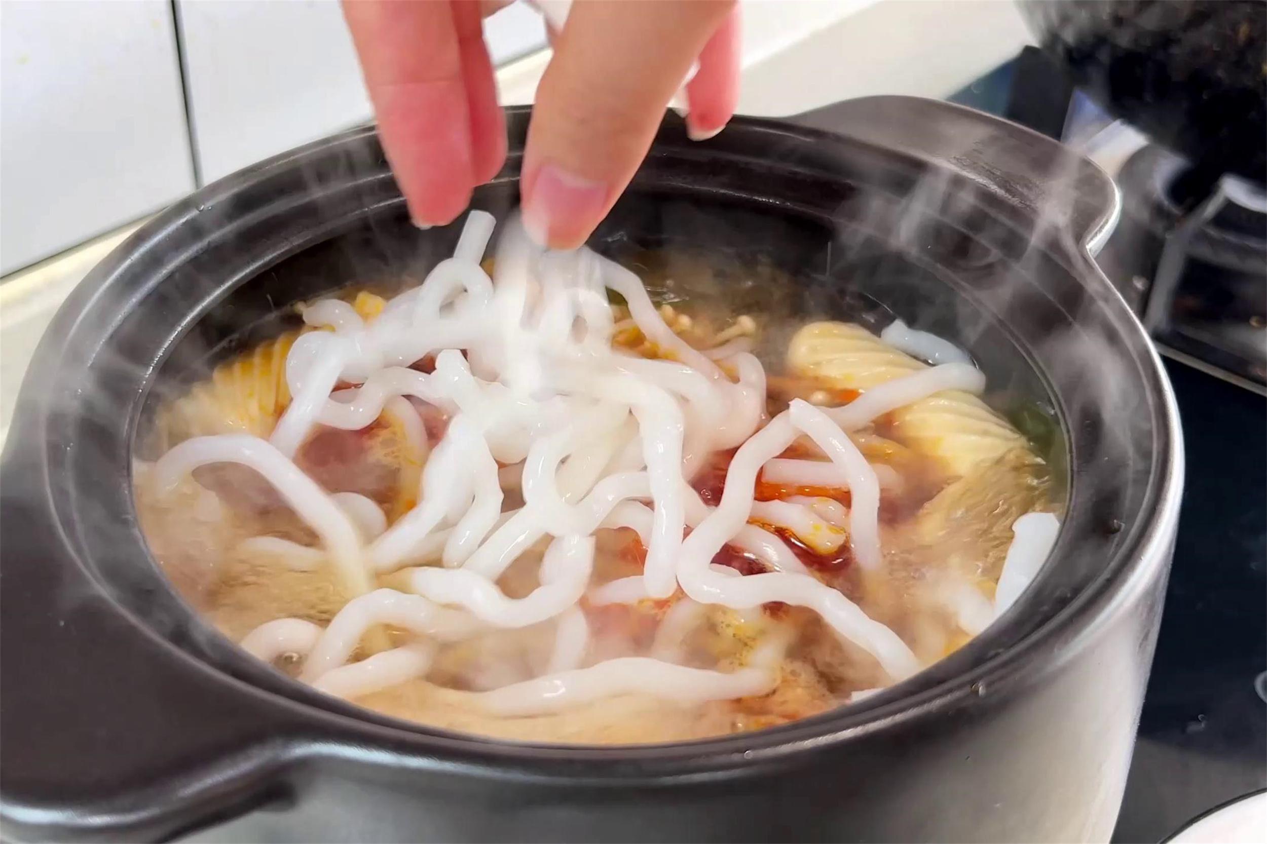5、把海带丝和金针菇倒进锅中,搅拌均匀,下入土豆粉,中火炖煮五分钟左右。