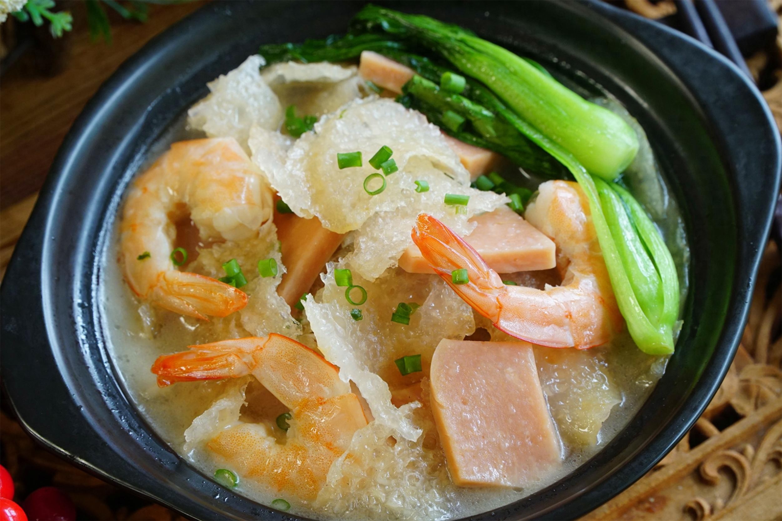 所需食材:皮肚、午餐肉、鲜虾、上海青、蒜、小葱、盐、鸡精、胡椒粉