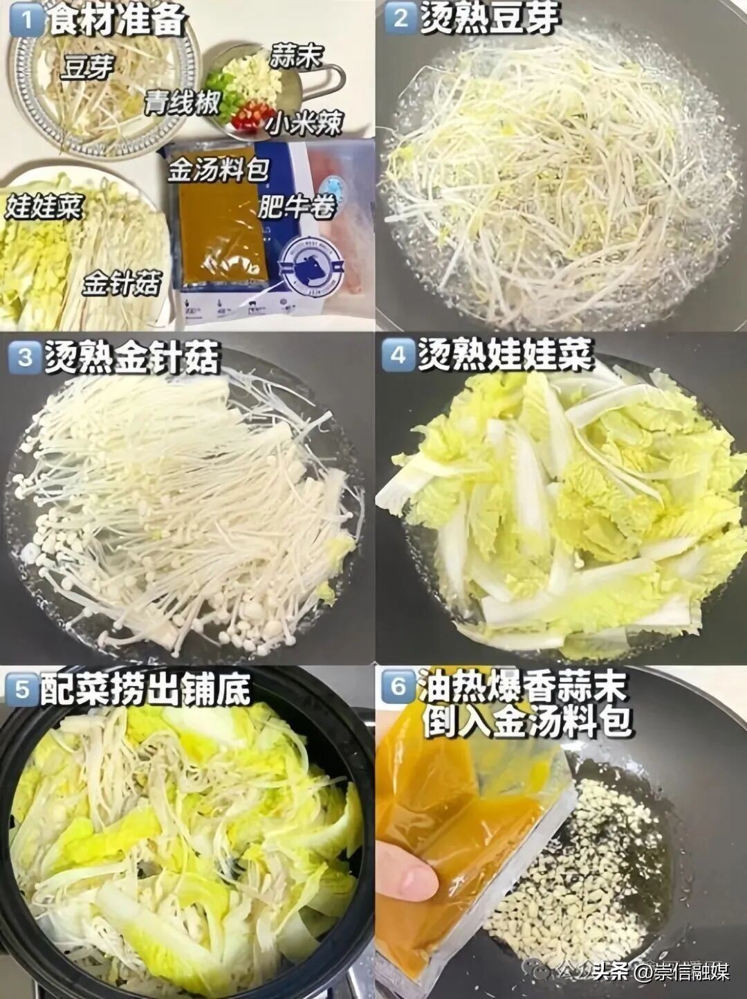 1. 豆芽、金针菇、娃娃菜分别焯烫熟,捞出沥干水分,铺在砂锅底。